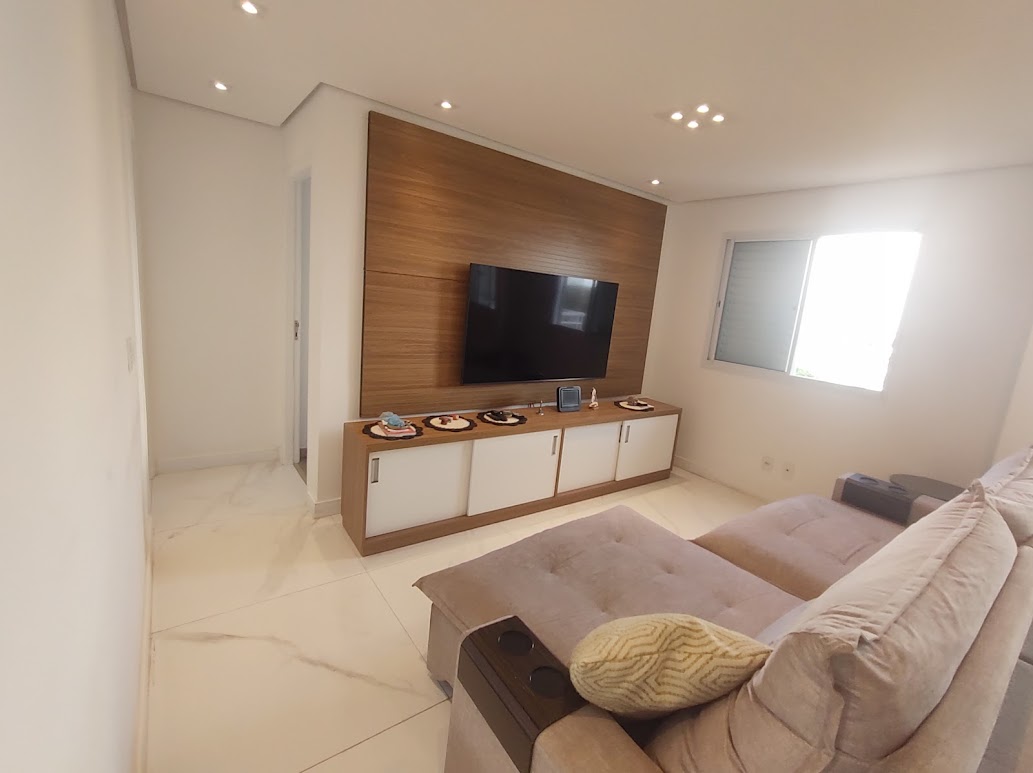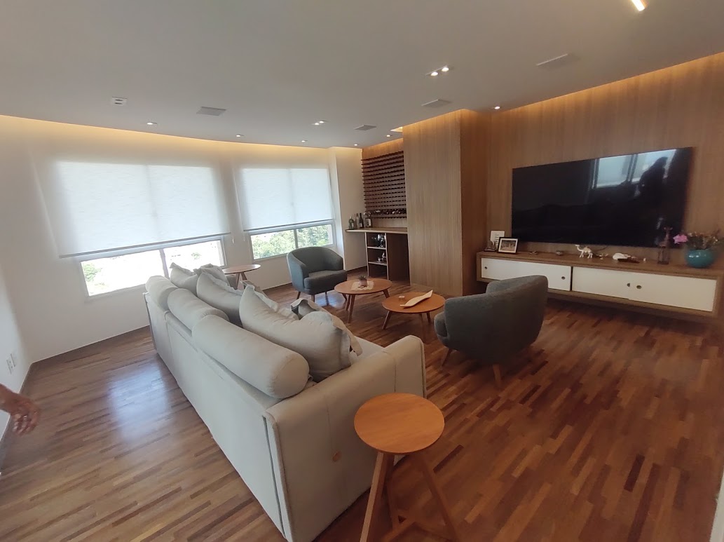 Sala com som embutido no teto, iluminação toda embutida e pensada na iluminação de cada ambiente da sala.