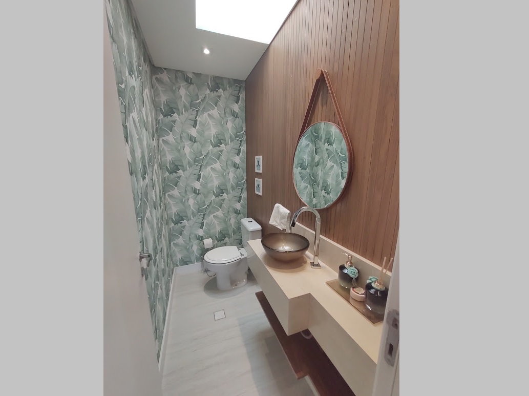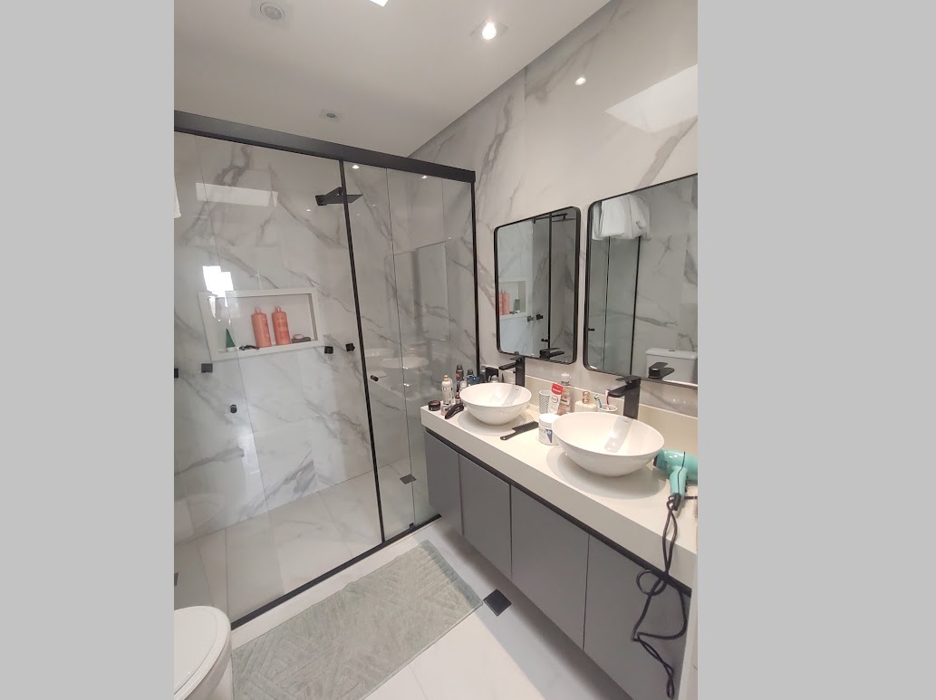 Banheiros com alto padrão de acabamento, com bancada em granito, nichos com iluminação exclusiva, box blindex e todos com ventilação natural, inclusive o lavabo.
