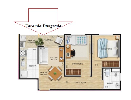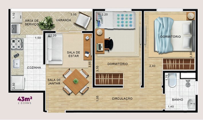 - 43m² Área útil- 1 Banheiro- 2 Quartos- Varanda Integrada- 1 Vaga de Garagem