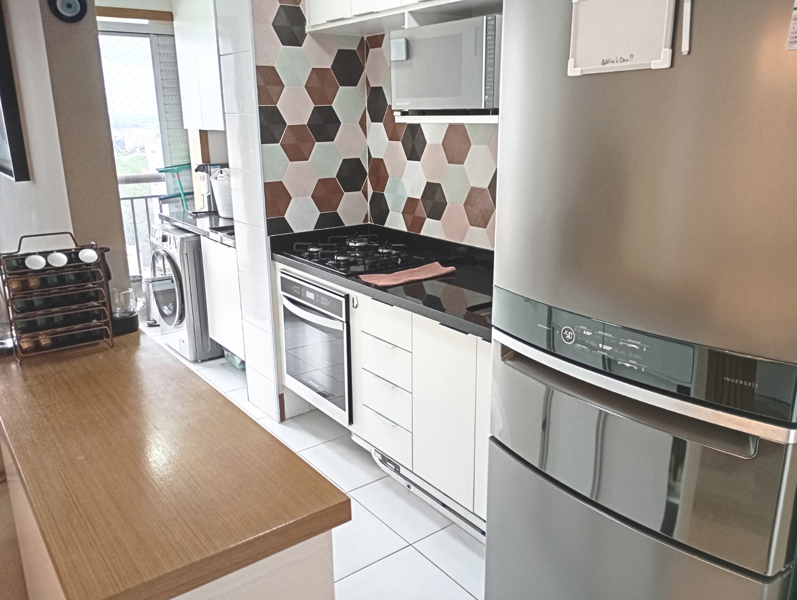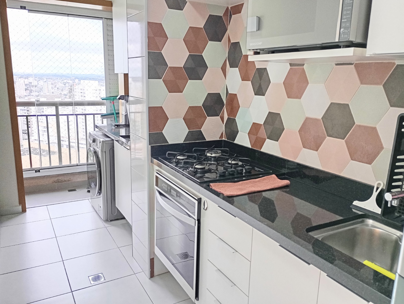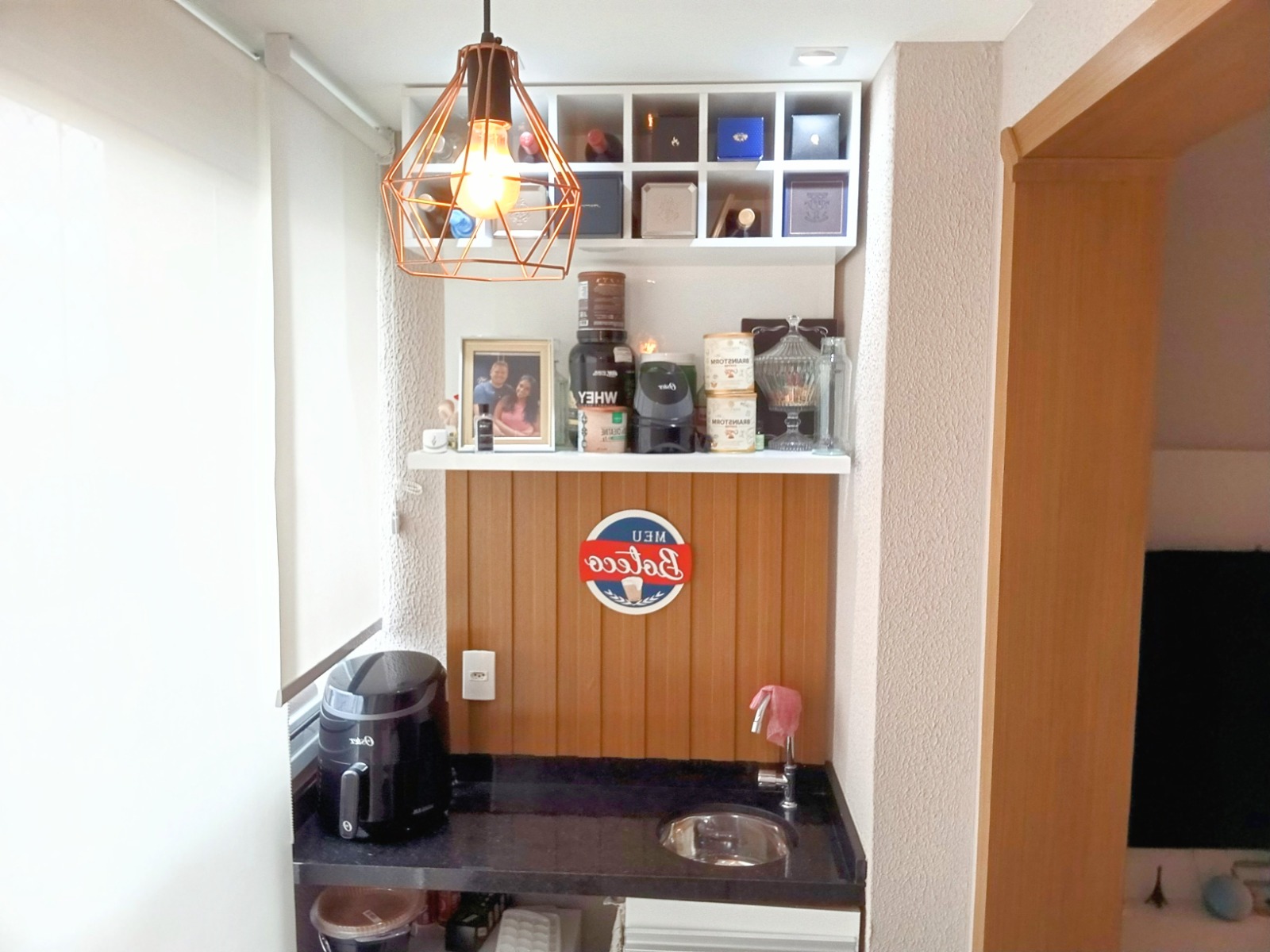 Varanda: Bancada em granito São Gabriel, cuba e torneira Espaço bem dividido com armário e área para frigobar Fechamento em vidro retrátil e persiana padrão do condomínio