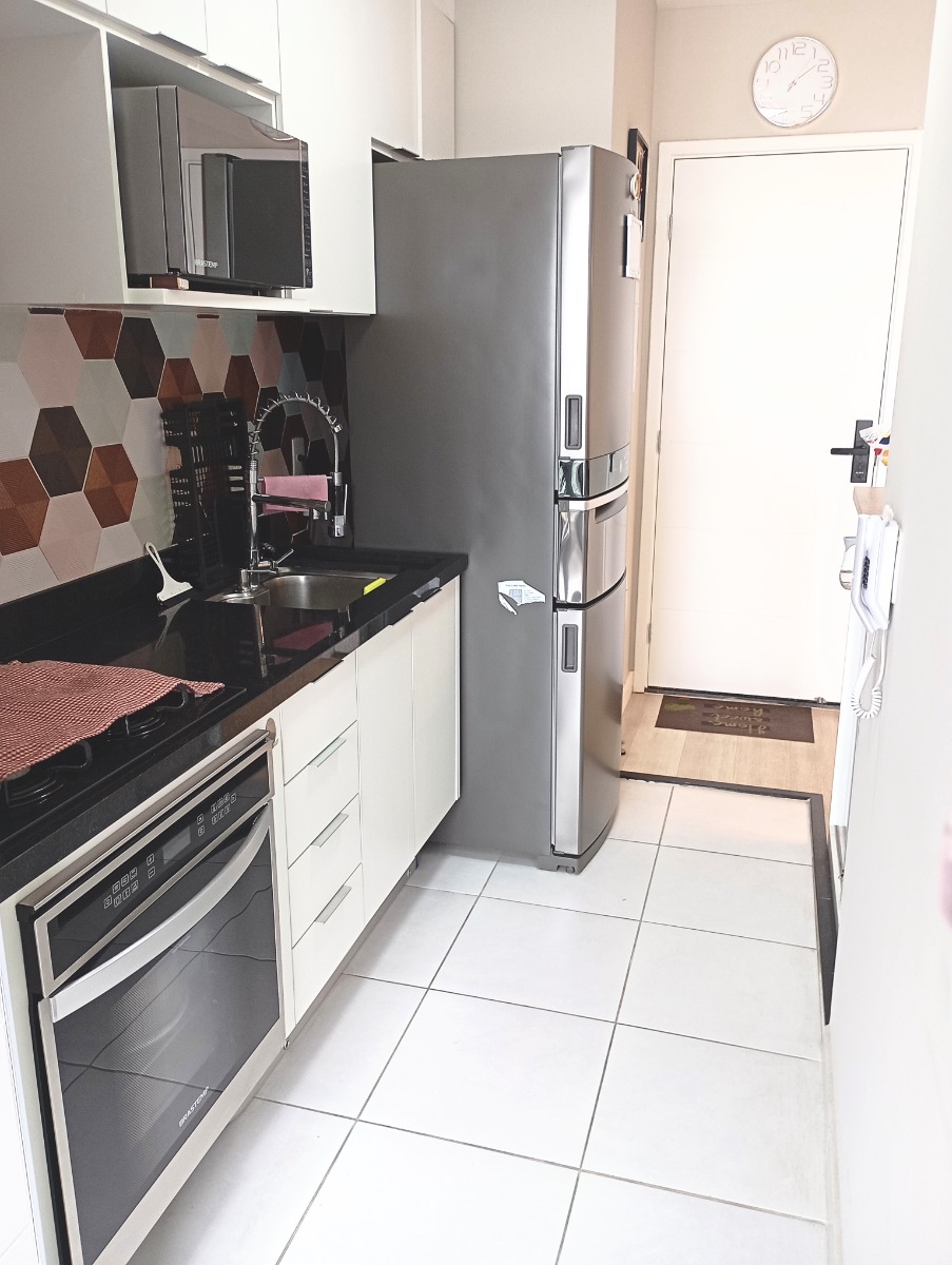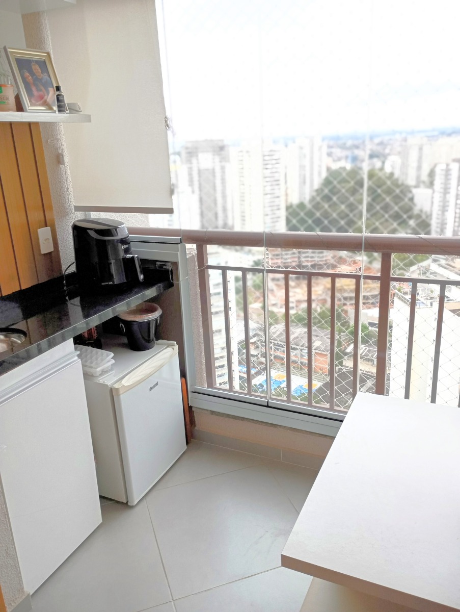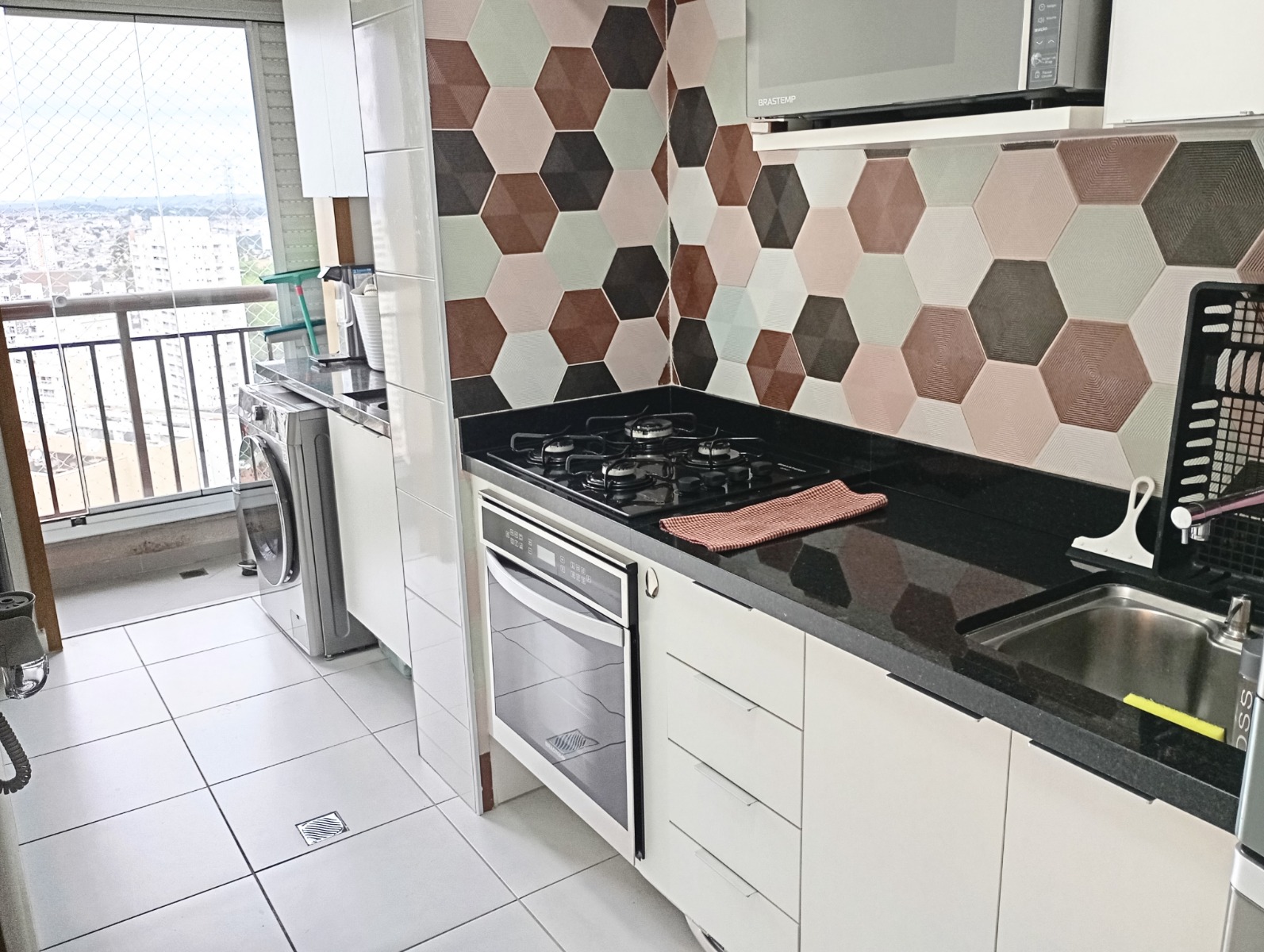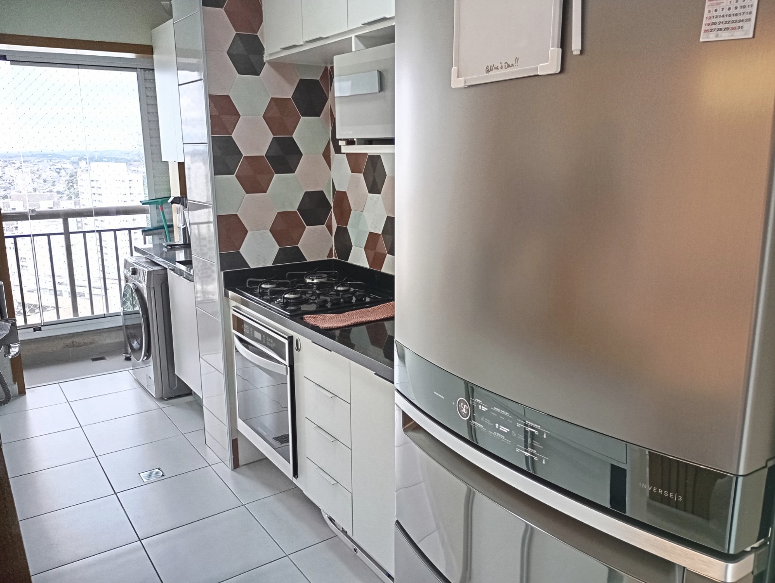 Varanda: Bancada em granito São Gabriel, cuba e torneira Espaço bem dividido com armário e área para frigobar Fechamento em vidro retrátil e persiana padrão do condomínio
