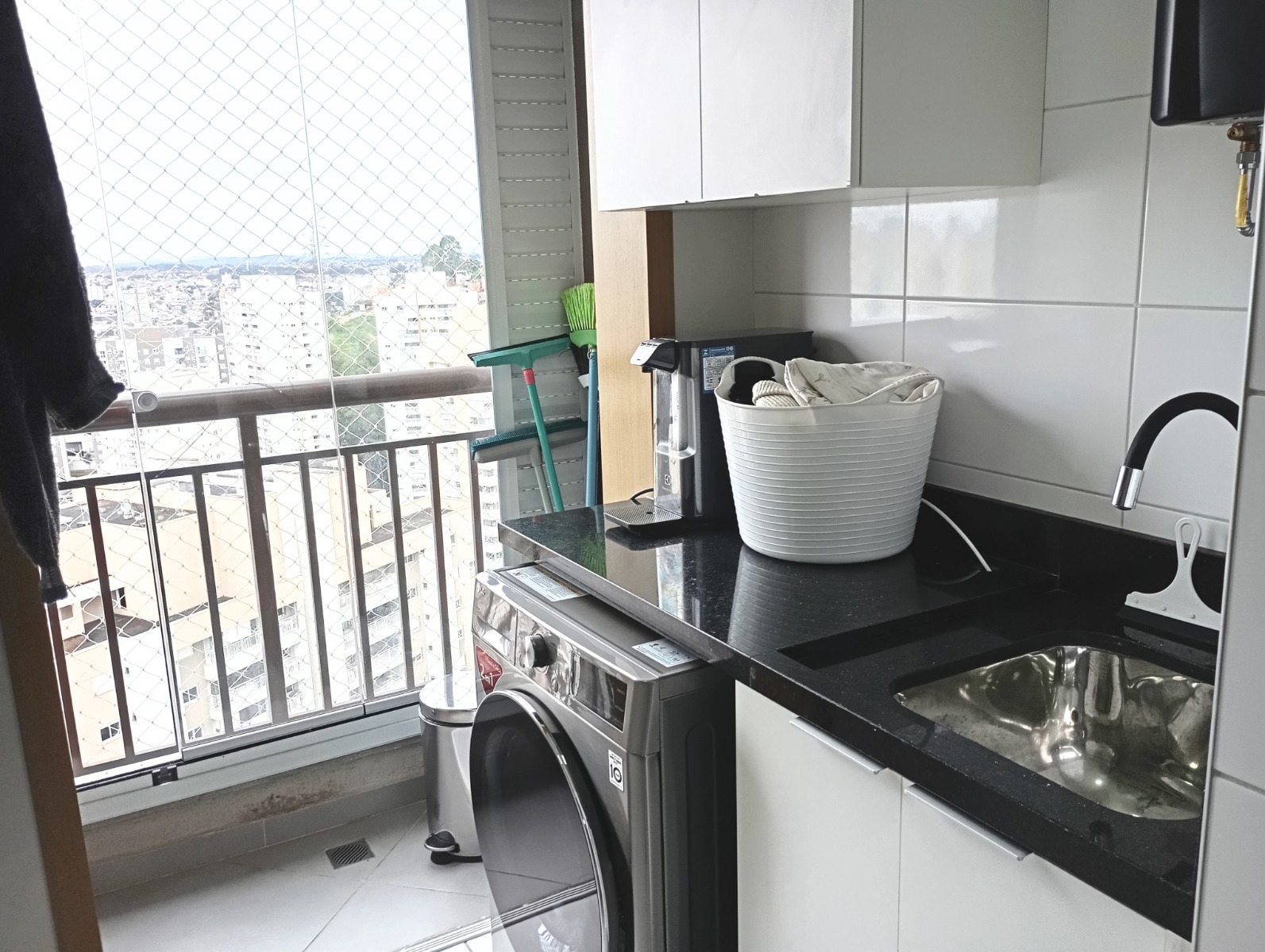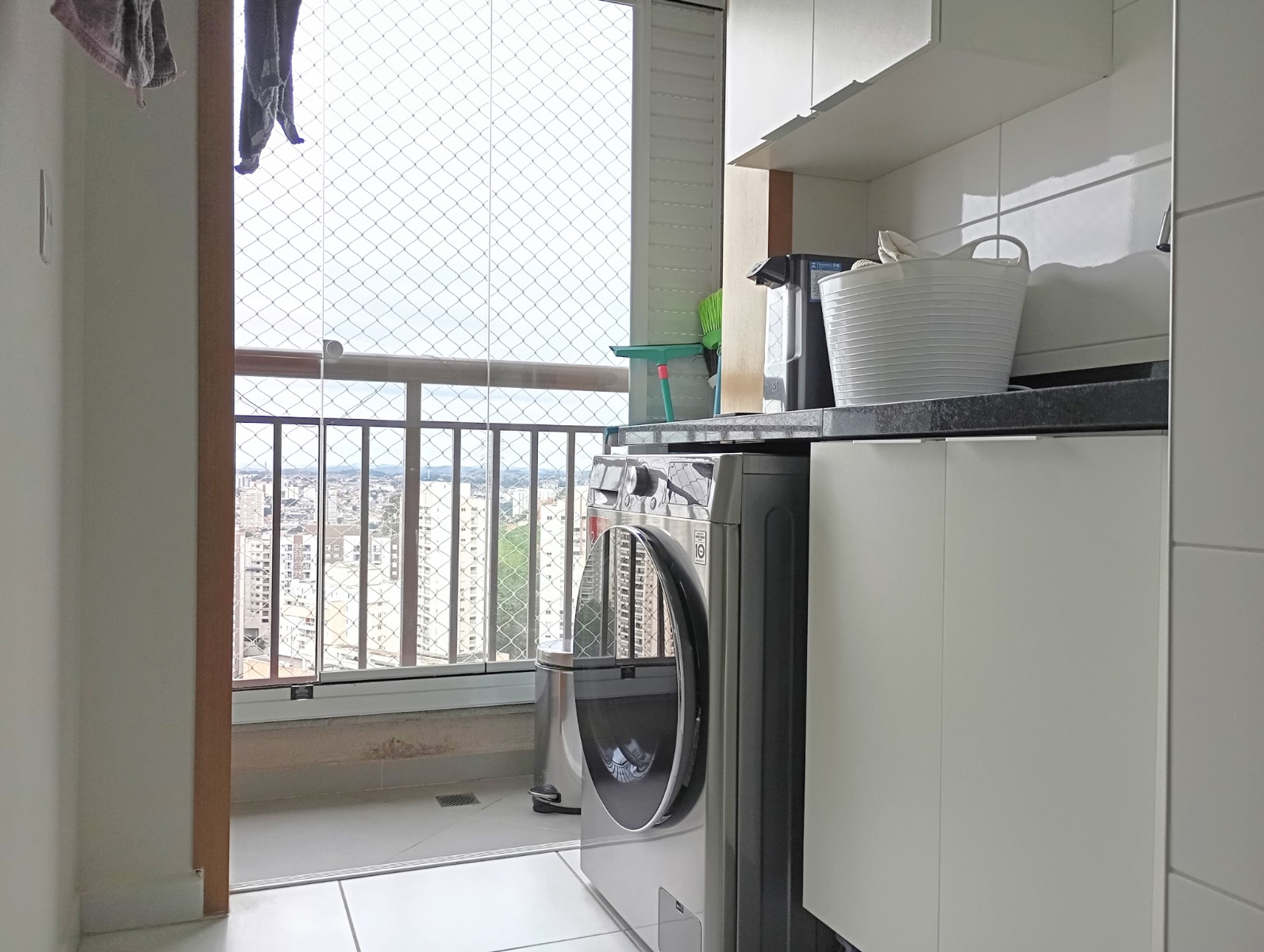 Lavanderia: Bancada em granito São Gabriel Espaço com cuba e bancada sobreposta à máquina lava e seca Armário e gabinete para otimização do espaço Iluminação natural através de varanda com fechamento em vidro retrátil
