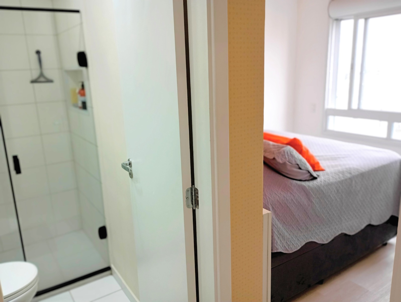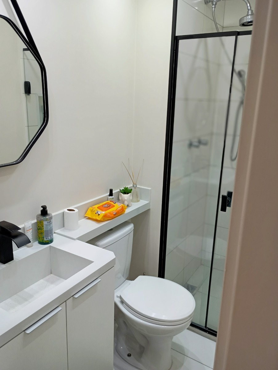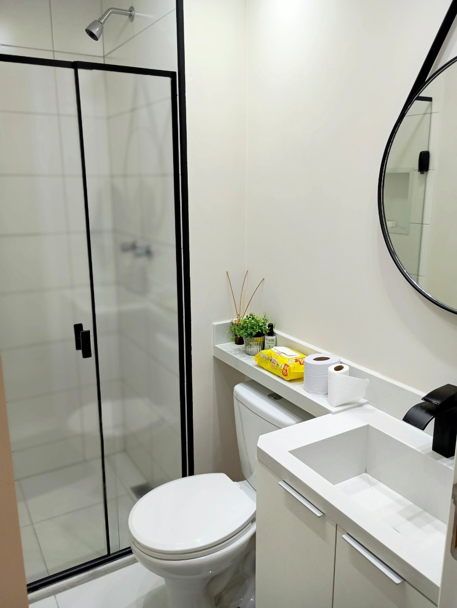 Banheiros: Bancada em granito branco Box com acabamento em alumínio black Chuveiro a gás para maior conforto.